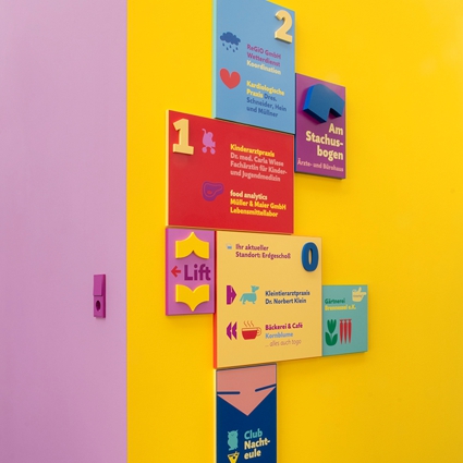 Signaletikkonzept für den Neubau des kbo-Kinderzentrums mit bedrucktem Holz und Türschildern mit Kreidetafeln.